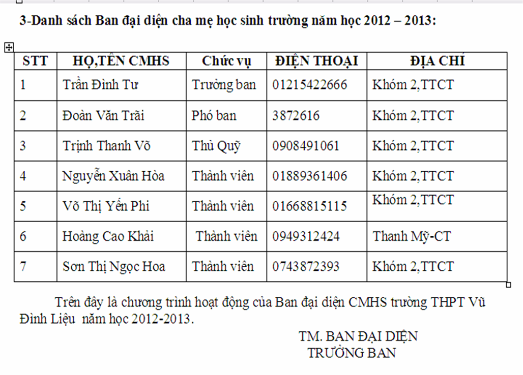 - Căn cứ vào kết quả thống nhất của CMHS về các nội dung hoạt động trong Đại hội CMHS đầu năm học 2012- 2013 tổ chức vào ngày 12 tháng 8 năm 2012 tại trường THPT Vũ Đình Liệu