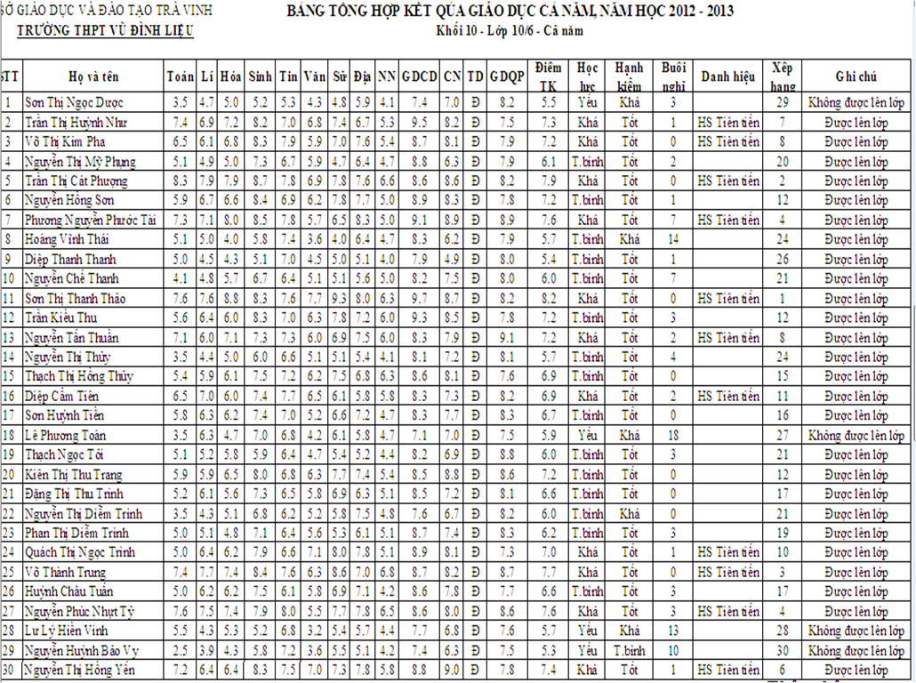 Kết quả học tập cả năm năm học 2012 - 2013 lớp 10.6