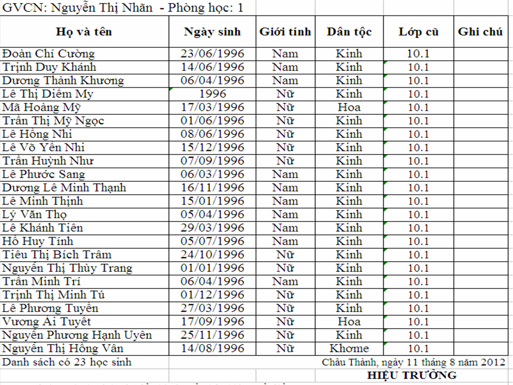 Danh sách học sinh lớp 11.1 năm học 2012 - 2013