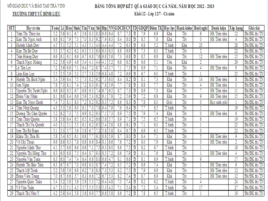 Kết quả học tập cả năm năm học 2012 - 2013 lớp 12.7