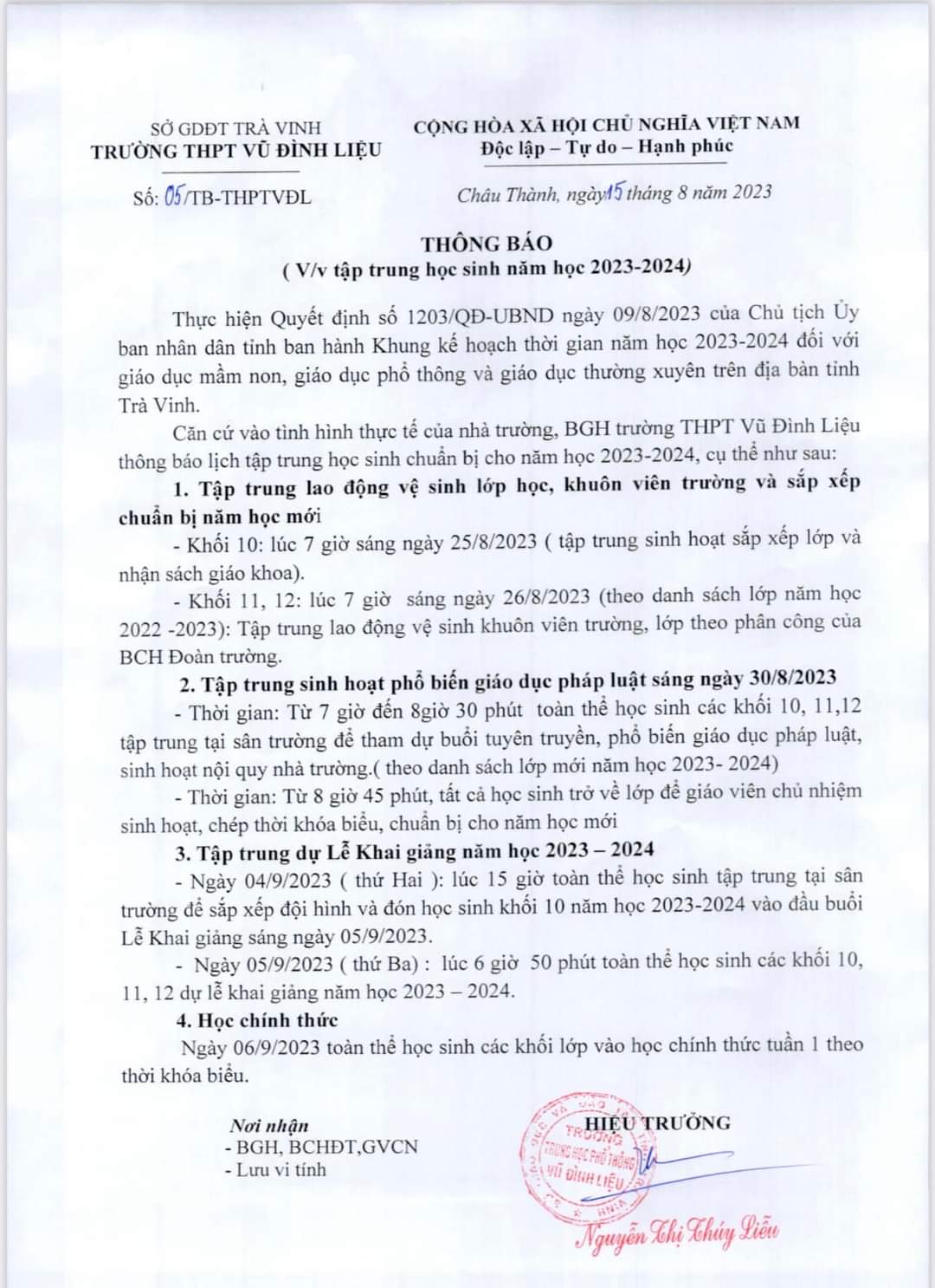 Thông báo về việc tập trung học sinh năm học 2023 - 2024