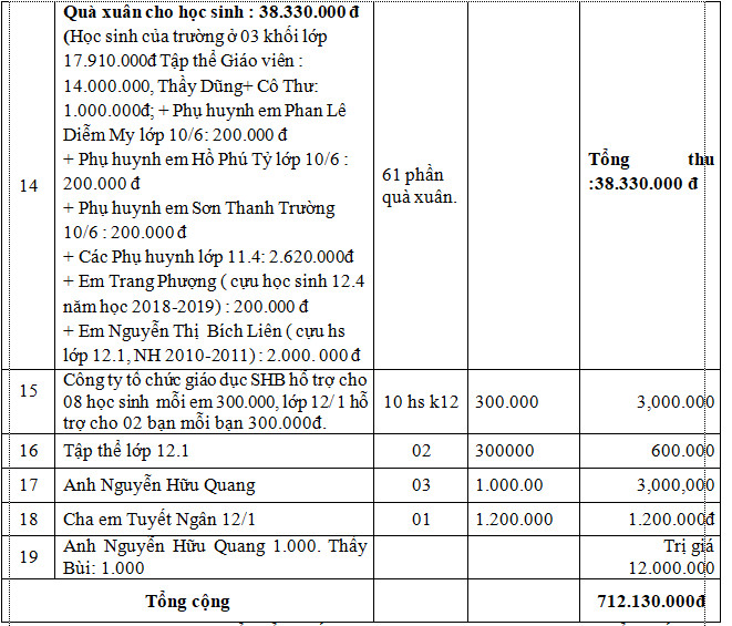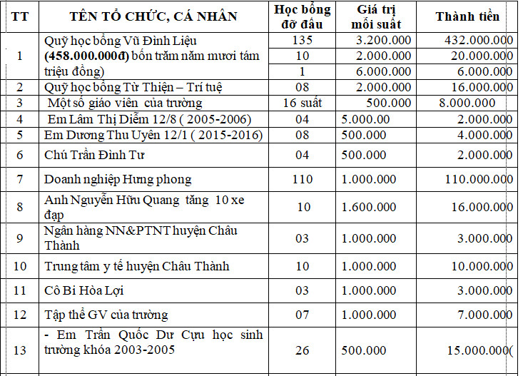 Trong năm học, công tác hỗ trợ , khen thưởng học sinh giỏi, đỡ đầu học sinh nghèo vượt khó của các tổ chức cá nhân trong và ngoài tỉnh. Với tổng số tiền 712.130.000đ